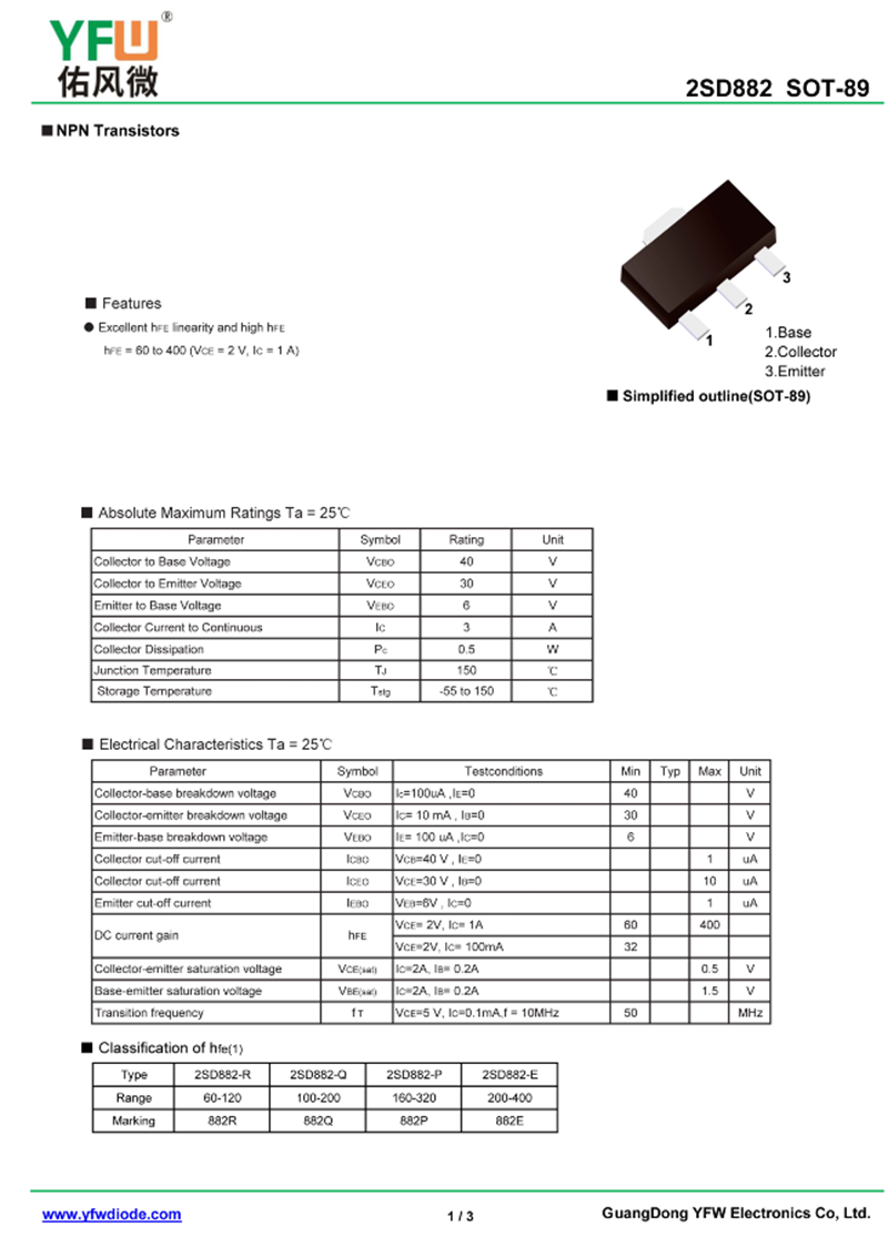 晶體管2SD882 規(guī)格書_價格_PDF手冊-廣東佑風微原廠2SD882 SOT-89_(YFW佑風微)品牌