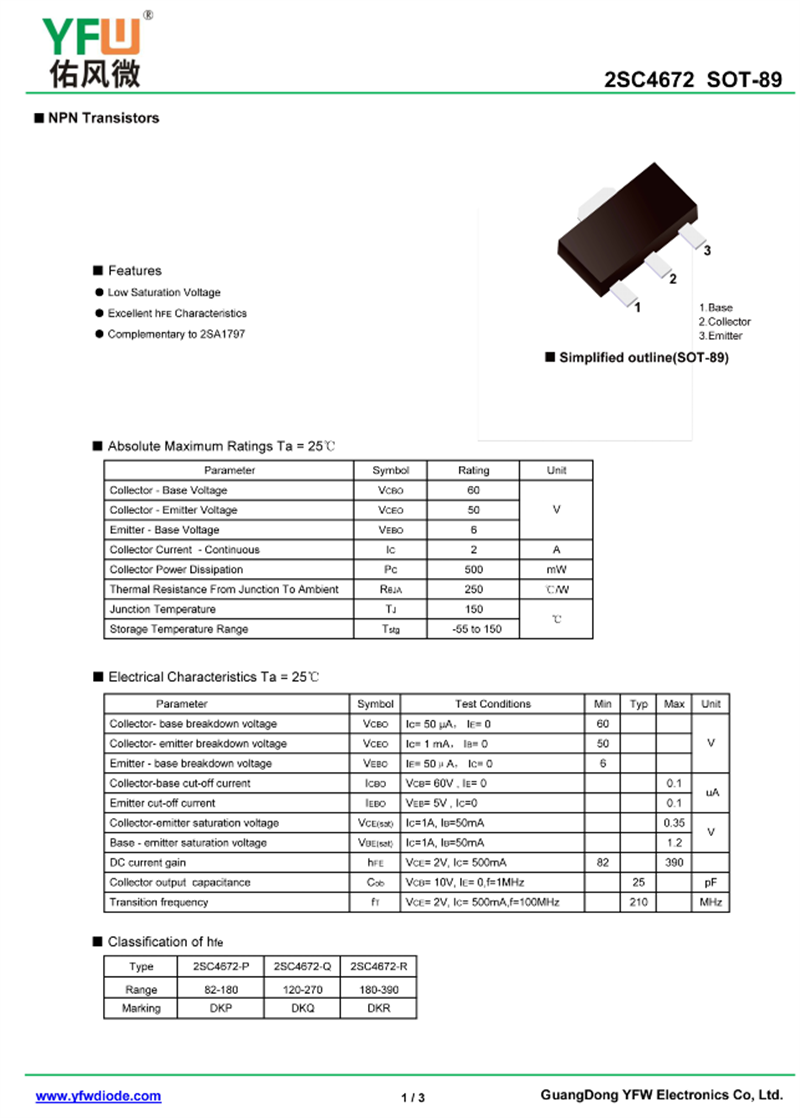 晶體管2SC4672 規格書_價格_PDF手冊-廣東佑風微原廠2SC4672 SOT-89_(YFW佑風微)品牌
