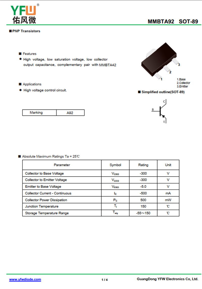 晶體管MMBTA92 規格書_價格_PDF手冊-廣東佑風微原廠MMBTA92 SOT-89_(YFW佑風微)品牌