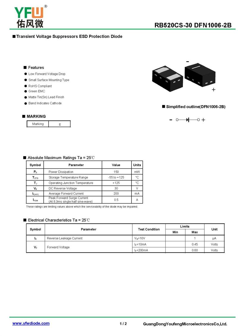 靜電保護二極管RB520CS-30 規格書_價格_PDF手冊-廣東佑風微原廠RB520CS-30 DFN1006-2B_(YFW佑風微)品牌