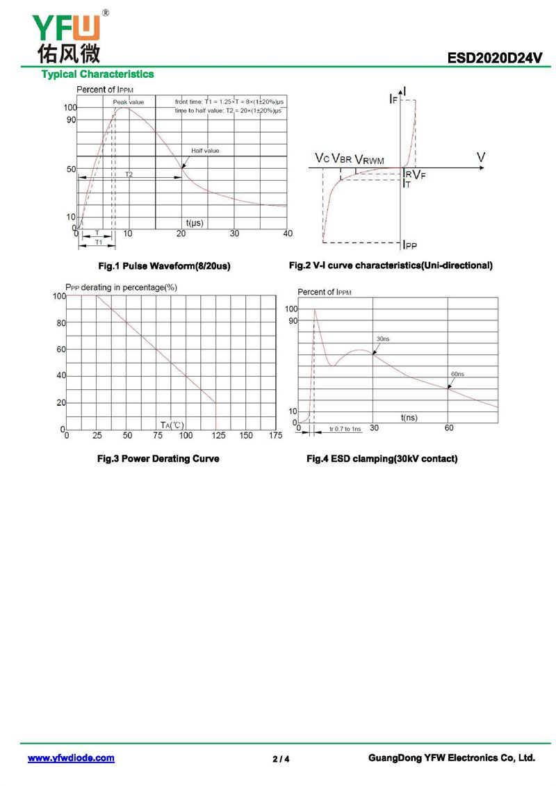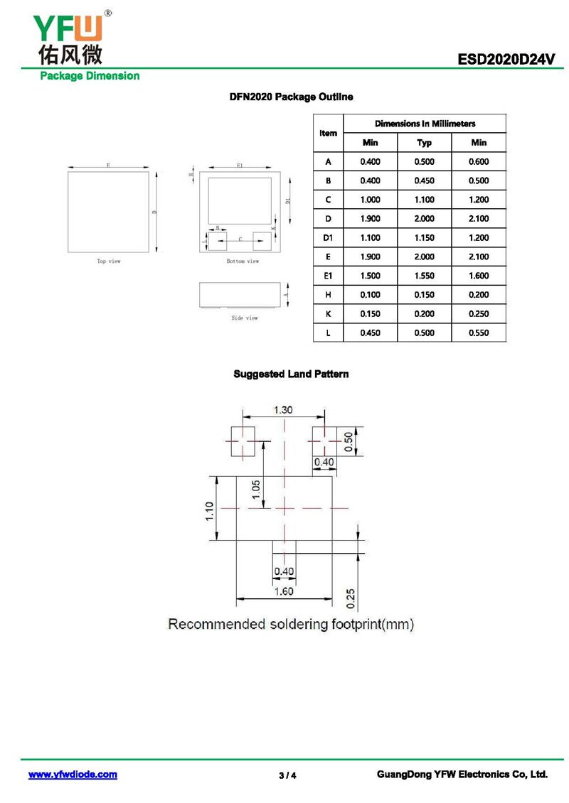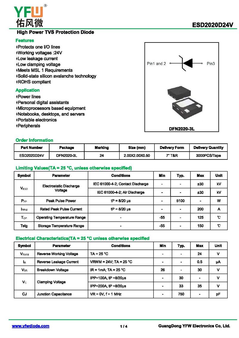 靜電保護二極管ESD2020D24V 規格書_價格_PDF手冊-廣東佑風微原廠ESD2020D24V DFN2*2-3L_(YFW佑風微)品牌