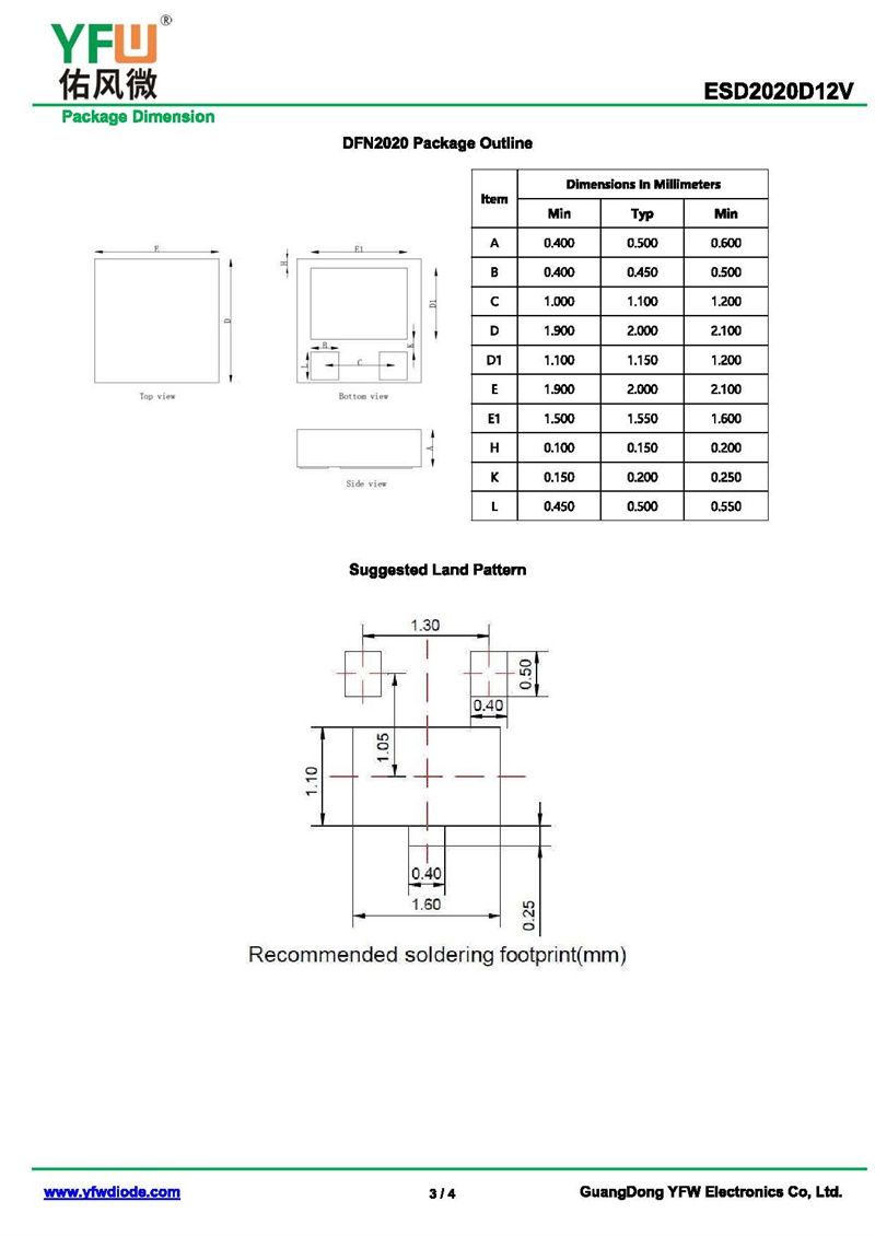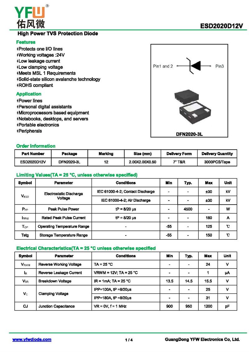 靜電保護二極管ESD2020D12V 規格書_價格_PDF手冊-廣東佑風微原廠ESD2020D12V DFN2*2-3L_(YFW佑風微)品牌