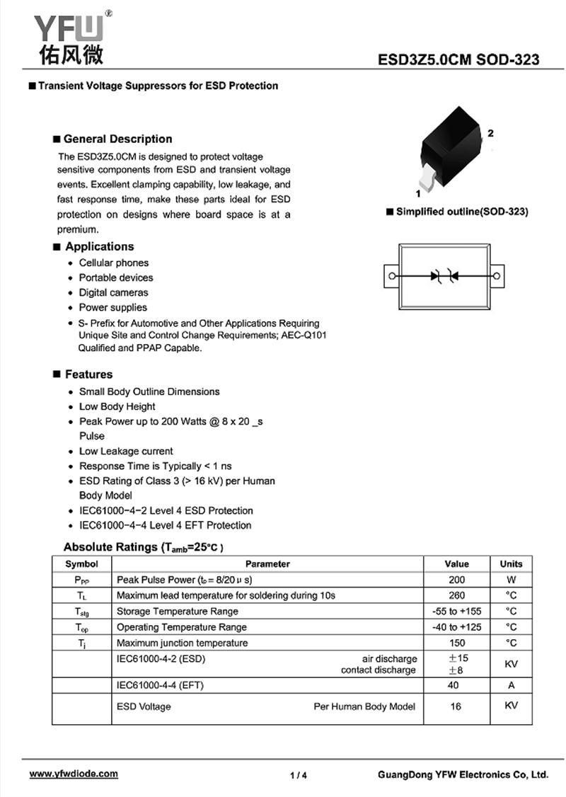 靜電保護二極管ESD3Z5.0CM 規格書_價格_PDF手冊-廣東佑風微原廠ESD3Z5.0CM SOD-323_(YFW佑風微)品牌