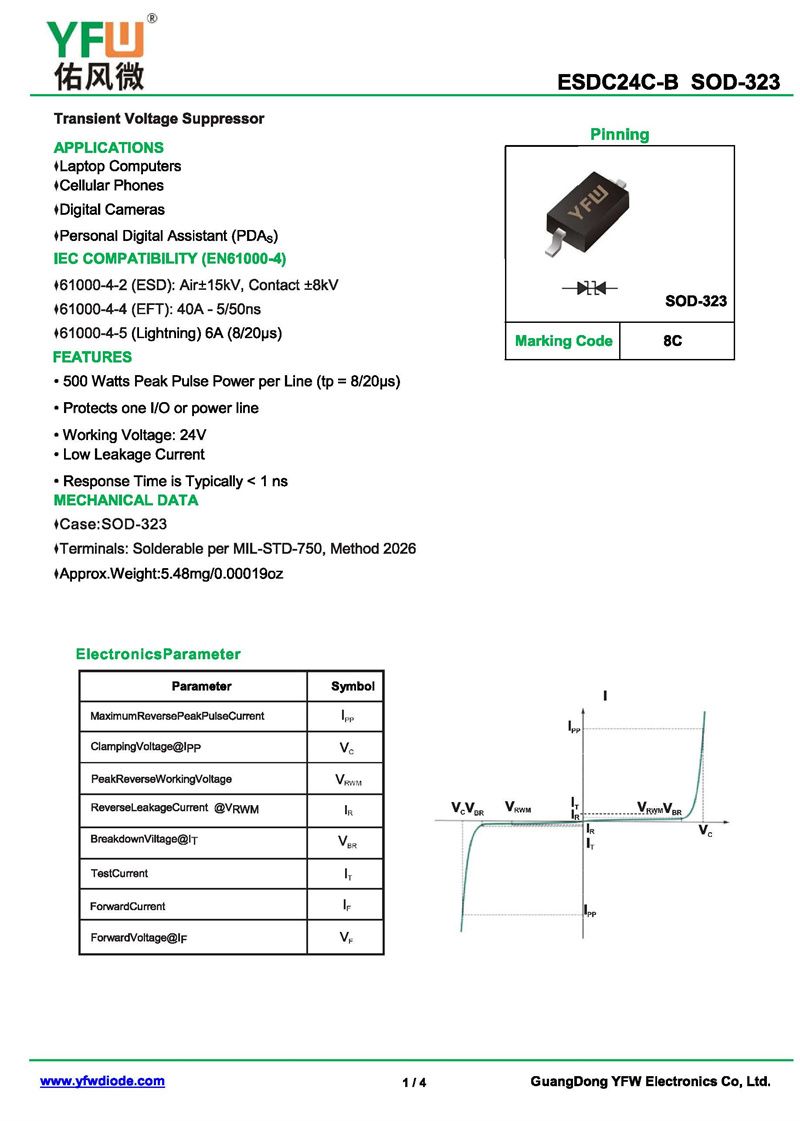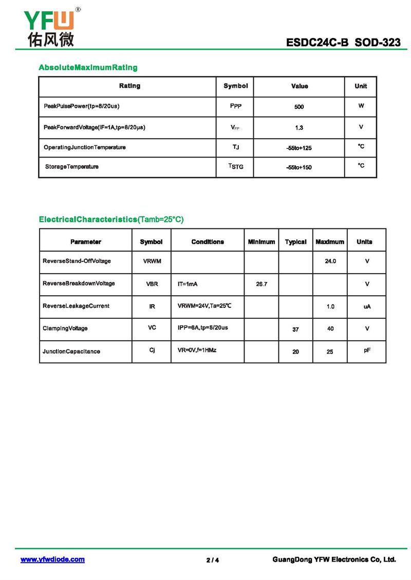 靜電保護二極管ESDC24C-B 規格書_價格_PDF手冊-廣東佑風微原廠ESDC24C-B SOD-323_(YFW佑風微)品牌