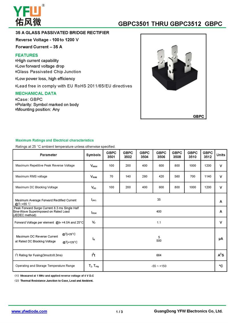 橋式整流器GBPC3508 規格書_價格_PDF手冊-廣東佑風微原廠GBPC3508 GBPC_(YFW佑風微)品牌